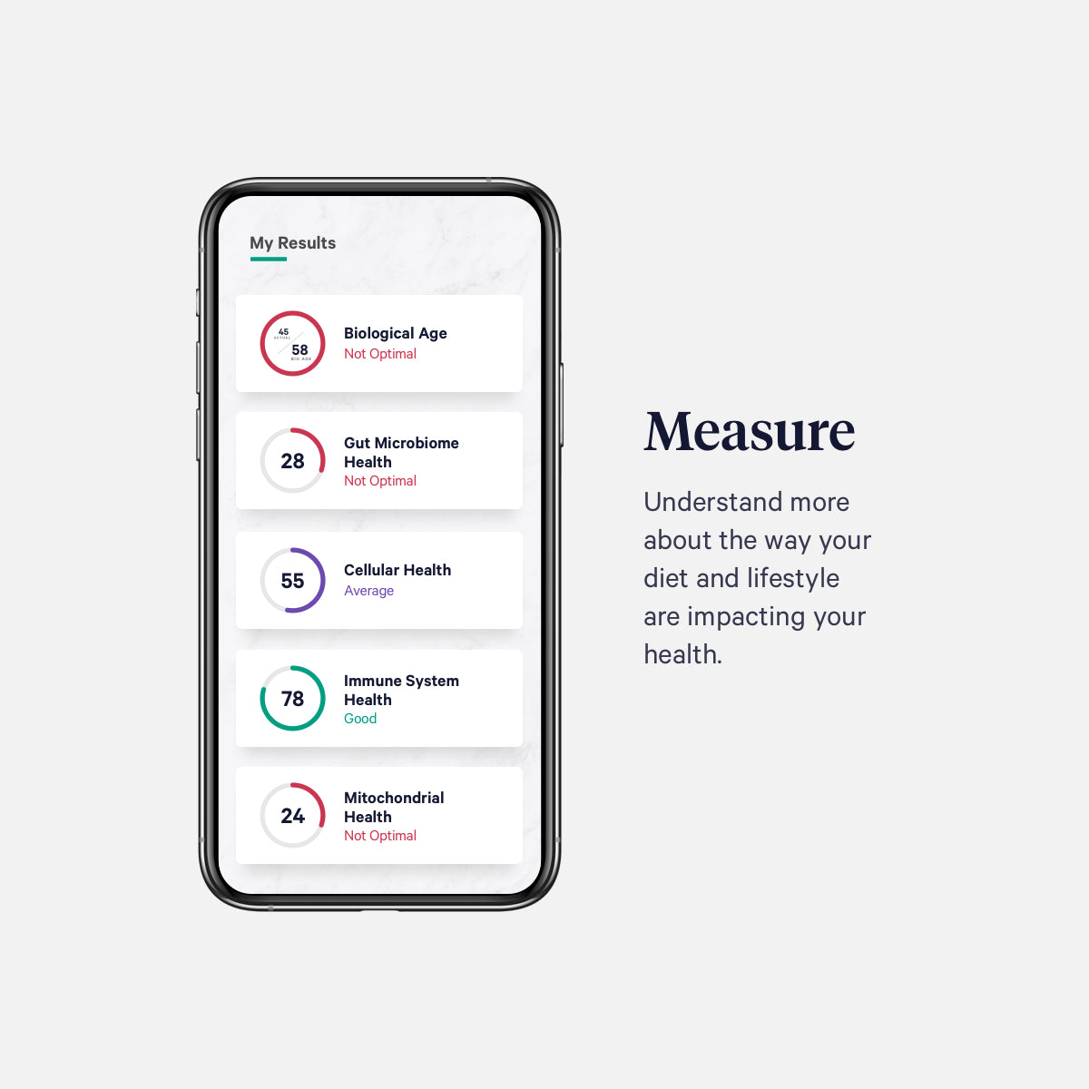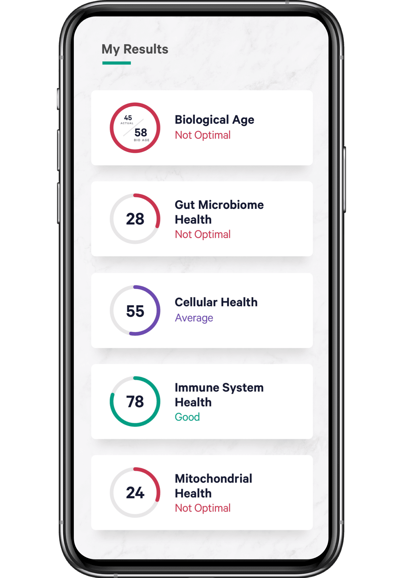 Our Health Intelligence™ Test goes beyond Gut Intelligence™ to analyze how the health of your gut microbiome and digestive health are helping or impairing other beneficial functions in your body that keep you healthy including your immune system, your cellular health, and how your body is aging internally.