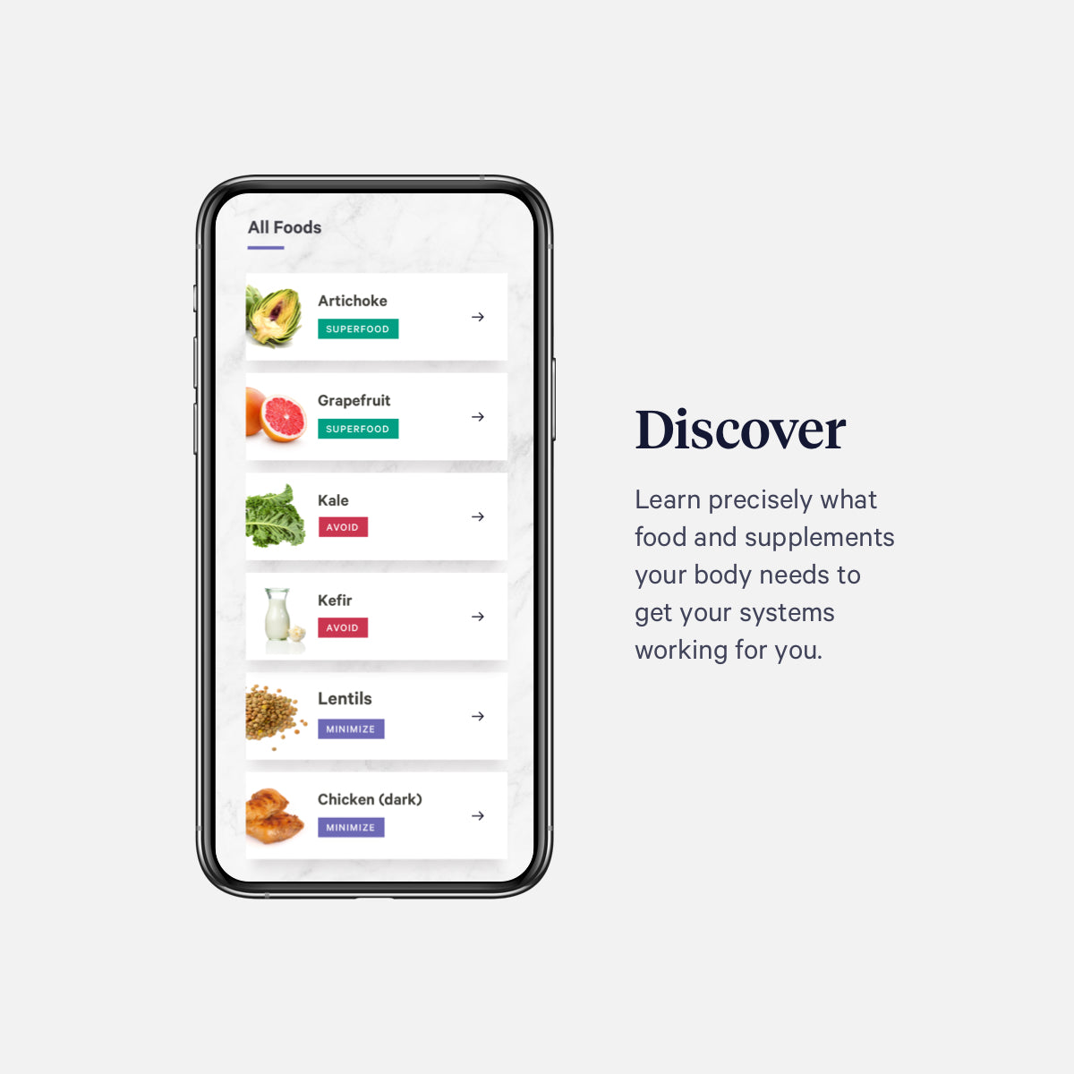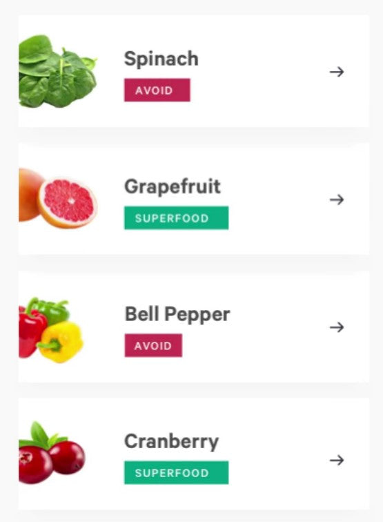 Over 400 foods sorted into your personal list of Superfoods, Enjoy, Minimize, & Avoid foods