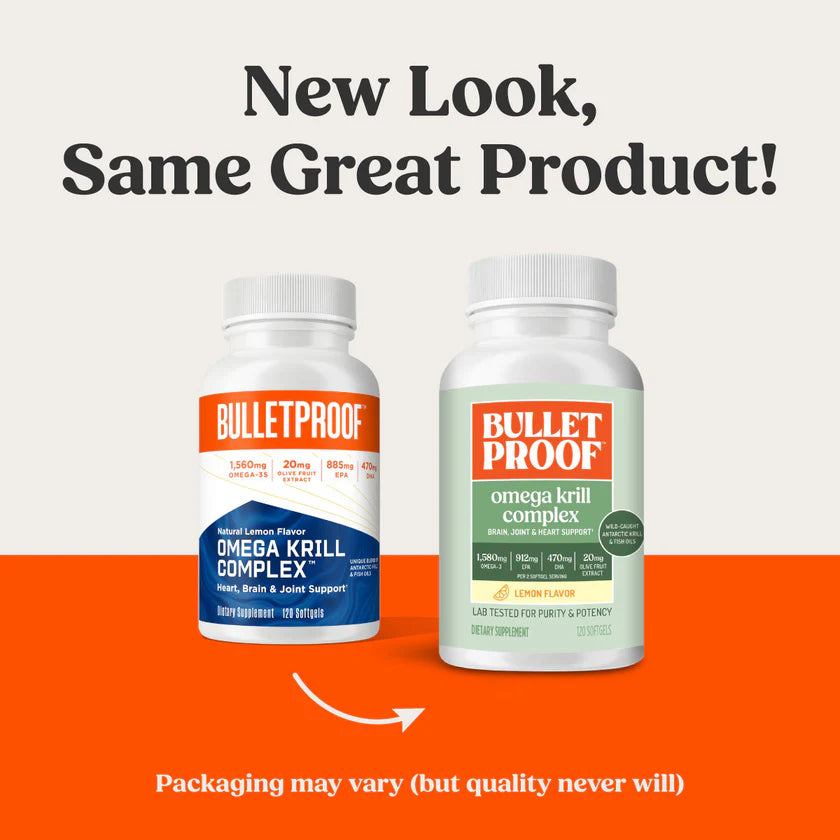 New Look, Same Great Product. Discover a better fish oil supplement with Omega Krill Complex. Its unique blend of wild-caught omega-3 krill oil and fish oil supports heart, brain and joint health. It's also fortified with astaxanthin and olive fruit extract for added antioxidants and GLA for omega-6 fatty acids. All these benefits are wrapped up in a convenient soft gel flavored with lemon. The result? A better fish oil supplement with less fishy flavor.†